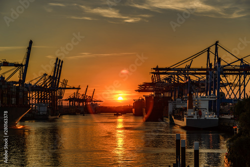 © Andrea, Obraz premium Port of Hamburg Waltershof at sunset