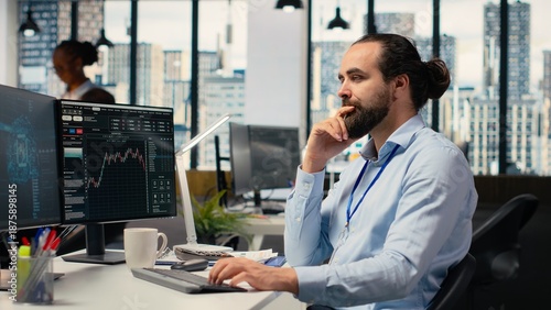 © DC Studio, Fototapeta premium Portfolio manager in office using artificial intelligence to evaluate capital allocation based on economic indicators. Prop firm expert using machine learning to do research driving growth