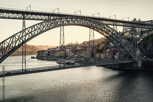 © Riccardo Cirillo, Obraz premium Porto cityscape with dom luis i bridge spanning douro river at sunset