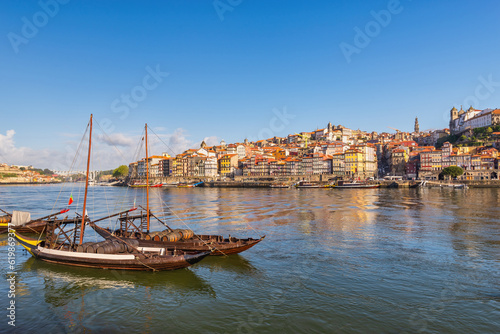 Obraz premium Porto Portugal, city skyline at Porto Ribeira and Douro River with Rabelo...