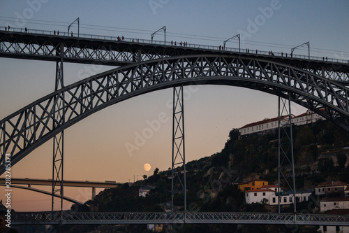 © Nataliia, Fototapeta premium Porto, Portugal - 10/20/2019: Famous Porto bridge Ponte Luis in the evening bottom view. Porto bridge in twilight with moon on background. Portuguese river Douro with metro bridge in evening dusk.