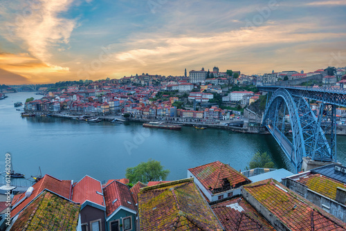 © Noppasinw, Obraz premium Porto Portugal, sunrise city skyline at Porto Ribeira with Douro River and Dom Luis I Bridge