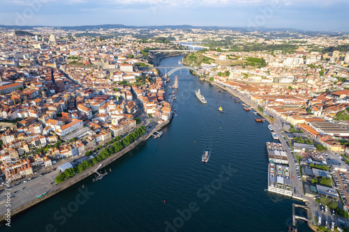 © Mike Workman, Fototapeta premium Porto, Portugal - Sunset aerial flyover above the Douro river and the city of Porto