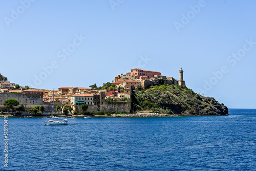 © bill_17, Fototapeta premium Portoferraio, Festung, Forte Stella, Falcone, Leuchtturm, Altstadt, Hafen, Insel, Elba, Fischerboote, Boote, Fähre, Fährhafen, Badestrand, Toskana, Toskanischer Archipel, Sommer, Italien