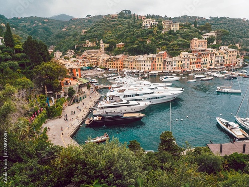 Fototapeta premium Portofino Liguria, colorful houses and yachts in the Bay, panorama of the city
