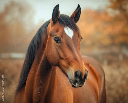 © Billy, Fototapeta premium Portrait a stunning mare with a white spot on her forehead in an autumn landscape