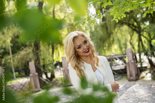 Naklejka premium Portrait beautiful smiling young woman in green summer city park