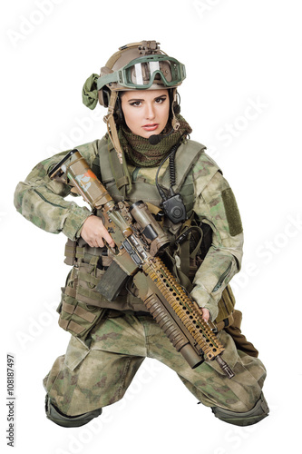 © kaninstudio, Fototapeta premium Portrait beautiful woman soldier or private military contractor with rifle