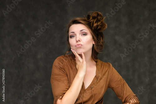 © Вячеслав Чичаев, Fototapeta premium Portrait below breast over gray background of pretty young brunette woman in brown dress with beautiful hair. Standing in different poses, talking, showing with hands, demonstrating emotions.