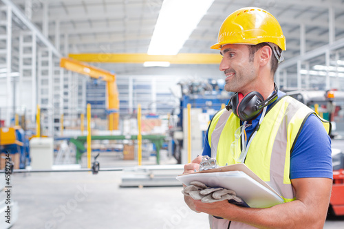 Fototapeta premium Portrait confident worker with clipboard in steel factory