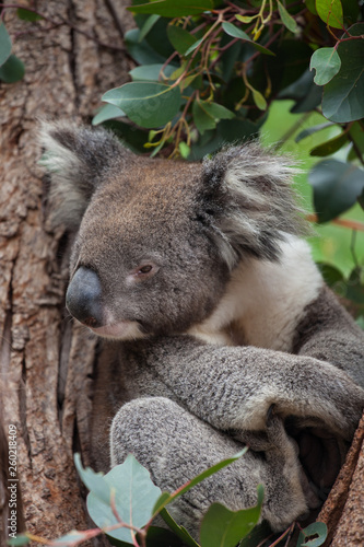 © Natalia, Naklejka premium Portrait cute Australian Koala Bear sitting in an eucalyptus tree and looking with curiosity. Kangaroo island.