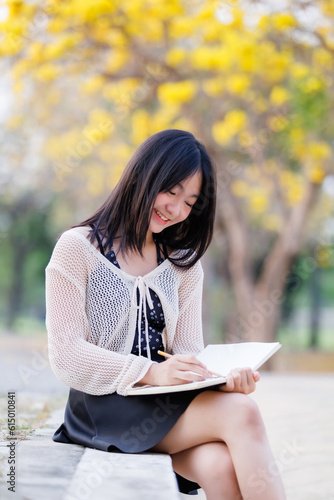 © Thinapob, Obraz premium Portrait cute smiles Asian of attractive young teenage girl a holding diary book writing note at Yellow Tabebuia Chrysotricha flowers with the park in spring day at Evening background in Thailand.