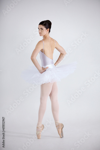 Naklejka premium Portrait, dance and ballet with a woman in studio on a white background for theatre performance rehearsal or recital. Art, creative and back with a young ballerina or dancer standing hands on hips