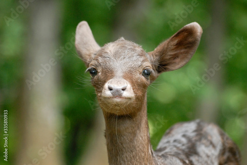 © Guillaume Leray, Fototapeta premium Portrait de petits daims noir au milieu d'une foret en Europe durant l'été.