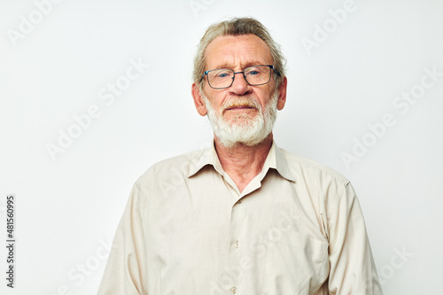 Obraz premium Portrait elderly man with a gray beard in a shirt and glasses light background