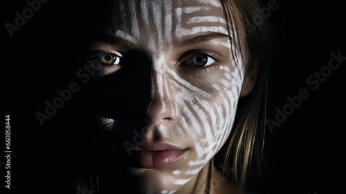© Filip, Fototapeta premium Portrait emphasizing contrast with a model's face half-covered in white ink, juxtaposed against a dark background