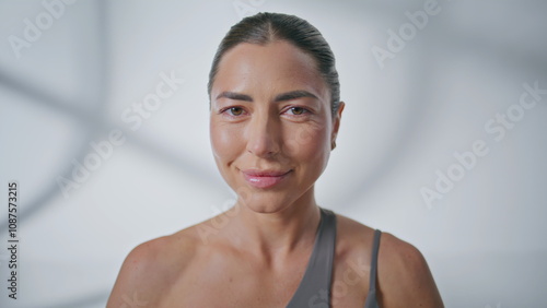 Obraz premium Portrait female yogi posing camera white wall background. Woman posing closeup
