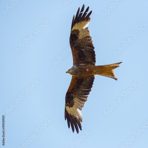 Obraz premium portrait flying red kite bird (milvus milvus), blue sky, spread wings