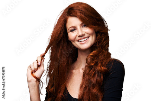 Obraz premium Portrait, ginger or woman smile with healthy long hair, grooming care or soft glow, growth or clean salon haircut. Face, strong locks or happy person hairstyle isolated on transparent, png background