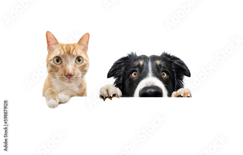 Fototapeta premium Portrait ginger orange cat peeking over and looking at camera. Isolated on...
