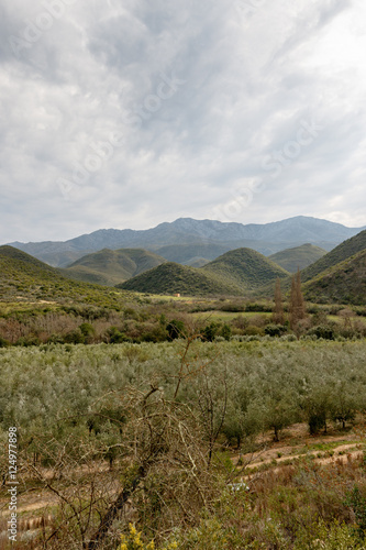 Naklejka premium Portrait - Green orchard view with mountains and moody clouds