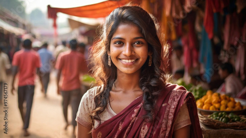 © marishkaTR, Fototapeta premium Portrait happy woman in traditional Indian attire, standing in marketplace with blurred background, depicting cultural and ethnic diversity