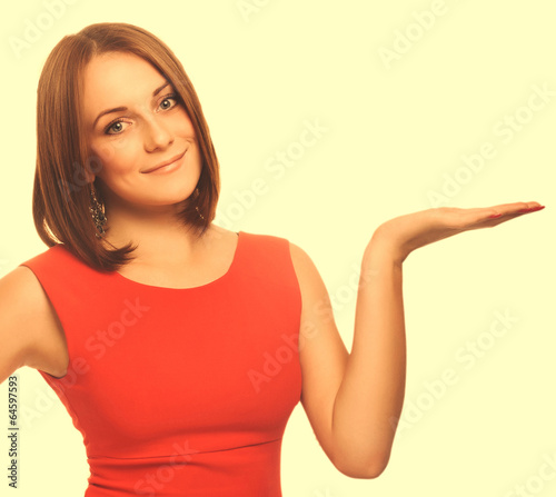 Fototapeta premium portrait happy young blond woman showing open hand holding in a