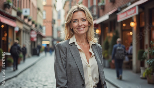 © f_bossa, Fototapeta premium Portrait headshot photo of diverse friendly people: A smiling businesswoman confidently poses on a charming, brick-lined street in a European city.
