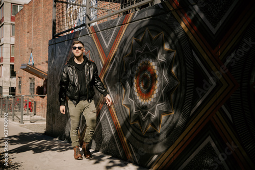 Obraz premium Portrait Headshots of a Young Handsome Attractive Modern Fashion Caucasian Male Guy Modeling near Local Outdoor Art in Urban City in Autumn Winter Season on Bright Sunny Day