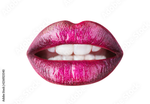 Obraz premium Portrait lips, lipstick or lipgloss. Beautiful lipstick, beauty lipgloss. Close up, macro with lip, mouth. Sexy lips, lip care. Sensual mouth, beautiful makeup, sexy make up.