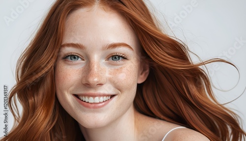 Fototapeta premium Portrait lumineux et naturel d’une jeune femme aux longs cheveux roux et taches de rousseur sur fond blanc minimaliste.