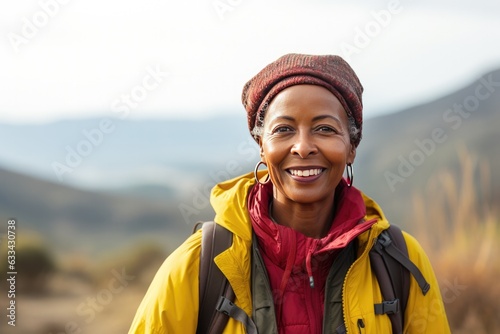 Fototapeta premium Portrait of a Active Healthy Black Woman Hiker Hiking. Aging Gracefully