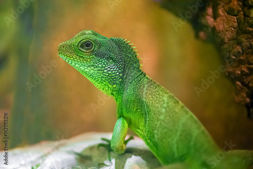 Fototapeta premium Portrait of a Asian Water Dragon on a stone in a vivarium. Physignathus...