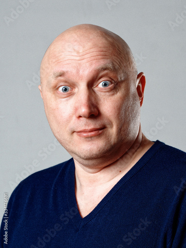 © makam1969, Fototapeta premium Portrait of a bald cheerful man on a gray background
