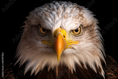 Obraz premium Portrait of a bald eagle on a dark background. Generative AI.
