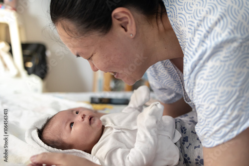 Obraz premium Portrait of a beautiful an Asian mother, with her nursing baby