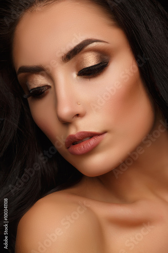© maksimvostrikov, Obraz premium Portrait of a beautiful and attractive girl with thick wavy brunette hair and evening golden makeup