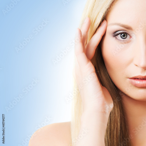 © Acronym, Naklejka premium Portrait of a beautiful and sensual woman on a blue background