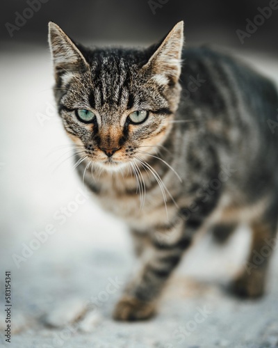 © Ricardoc94/Wirestock Creators, Naklejka premium Portrait of a beautiful angry striped cat walking in a field with a blurry background