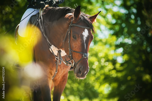 Fototapeta premium Portrait of a beautiful bay horse with a bridle on its muzzle and a rider in the saddle among the green leaves of trees on a sunny summer day. Horse riding. Equestrian sports.