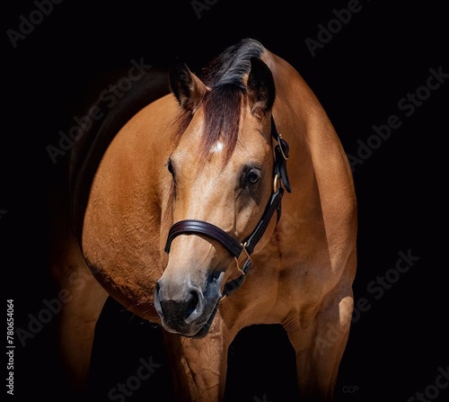 © mamo studios, Fototapeta premium Portrait of a beautiful black horse on a black background, Horse on dark backround.