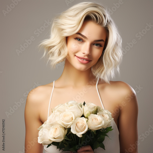 © Svetlana, Naklejka premium portrait of a beautiful blonde girl with a bouquet of white roses on a neutral background