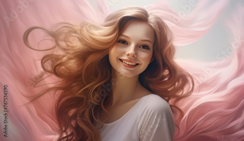 © Surachetsh, Fototapeta premium Portrait of a beautiful Blonde Hair of caucasian woman with a bright smile for shampoo advertising concept Hair conditioner and cosmetic products on pastel pink background.