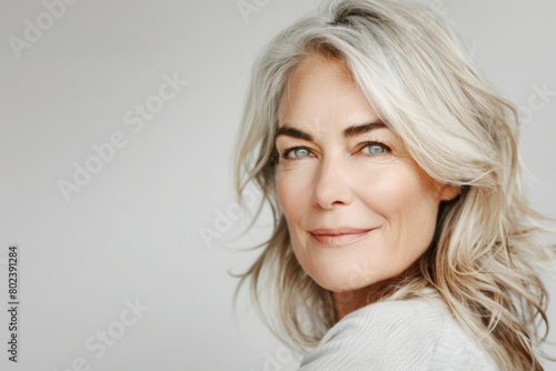 Fototapeta premium Portrait of a beautiful elderly woman in close-up. A picture of the face of a mature blonde with clean, fresh skin on a light background.