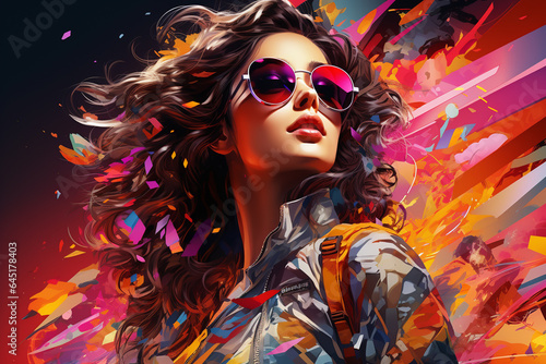 Obraz premium Portrait of a beautiful fashionable woman with curly hair and sunglasses.
