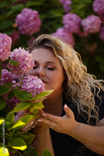 © Вероника Зеленина, Fototapeta premium Portrait of a beautiful fat girl in a blue dress, against the background of a wall of live growing pink gartenias. The plus size woman enjoys the beauty of flowers