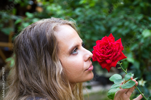 Fototapeta premium Portrait of a beautiful girl with a red rose