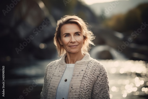 Fototapeta premium Portrait of a beautiful middle-aged woman in a knitted sweater on the background of the river