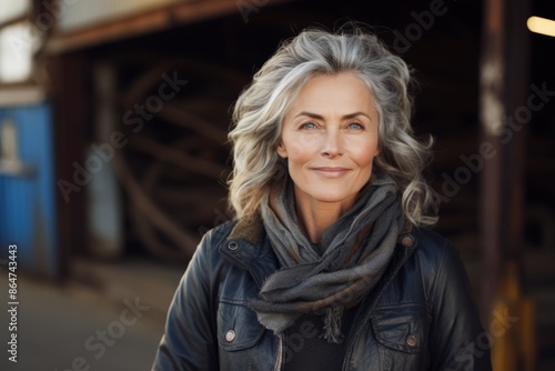 © Stocknterias, Fototapeta premium Portrait of a beautiful middle-aged woman in a leather jacket and gray scarf