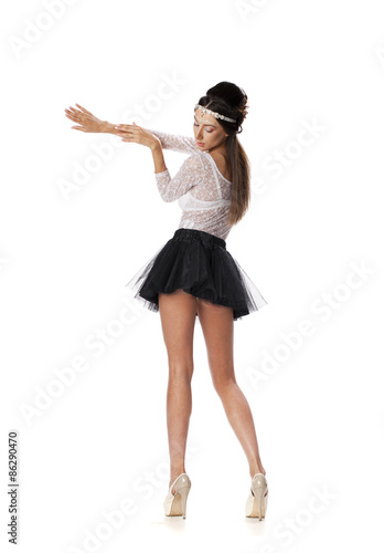 © Andrey_Arkusha, Naklejka premium Portrait of a beautiful slim model in black skirt and white blou